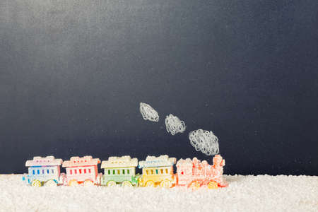 covered locomotive train toy with smoke in snow on chalkboard background, winter holidays concept, copy space