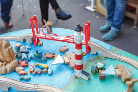 Wooden train model in a children's playroom. Educational toys.