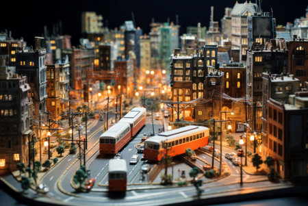 Detailed miniature urban scene with model trains, buildings, and city lights in a nighttime setting