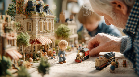 Elderly man and young boy playing with miniature train and toy buildings in a sunlit rustic room, evoking warmth, nostalgia, and bonding.