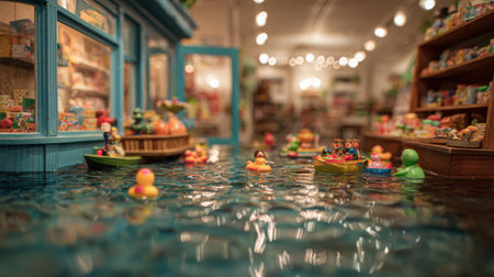 A whimsical scene showcasing colorful toy boats floating in water inside a vibrant shop, illuminated with warm lights. The playful atmosphere invites joy and creativity.