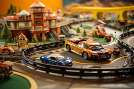 Scale model cars speed around a winding track filled with colorful buildings and playful decorations, showcasing a lively and intricate design that captures the joy of racing.