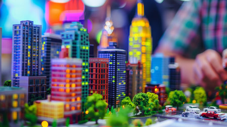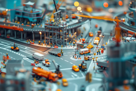 Macro shot of miniature futuristic city model. Architectural detail. Urban planning concept for design, poster, and wallpaper. Vibrant with vehicles, construction, people.