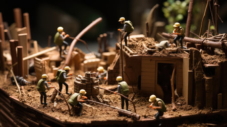 Plastic toy figures of construction workers with construction equipment at a construction site