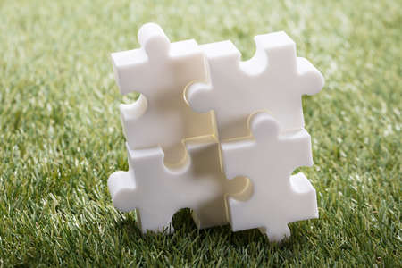 Elevated View Of Four White Jigsaw Puzzle On Green Grass
