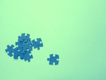 Unfinished white jigsaw puzzle pieces on blue background, The last piece of jigsaw puzzle, Copy space.