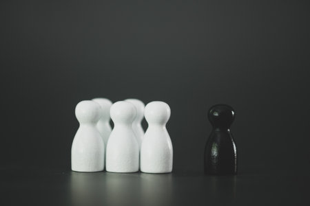 Black wooden figures as unique stands in a crowd of white wooden figures. Leadership, Human Resource Management, Recruitment and Hiring concept. Successful competition winner and Leader with influence