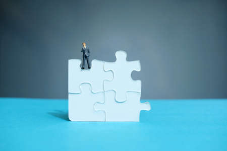 Miniature businessman standing in the center of the jigsaw puzzle piece. Business strategy conceptual
