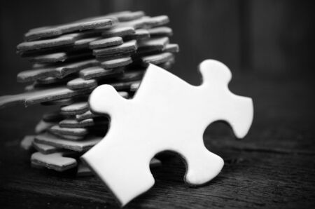 Puzzle. Many puzzle pieces on white background. The concept of collective thinking