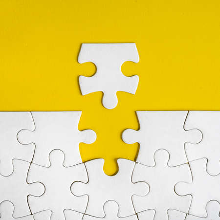 White jigsaw puzzle. White puzzle pieces on color background. Unfinished white jigsaw puzzle pieces on color background.