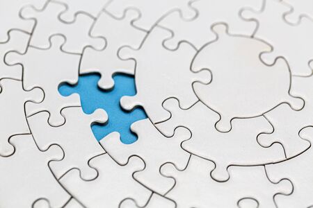 Unfinished white jigsaw puzzle pieces on blue background, The last missing piece of the jigsaw puzzle.