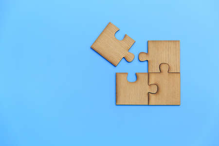 White jigsaw puzzle pieces on blue background. Texture photo with space for text. Teamwork conceptual photo.