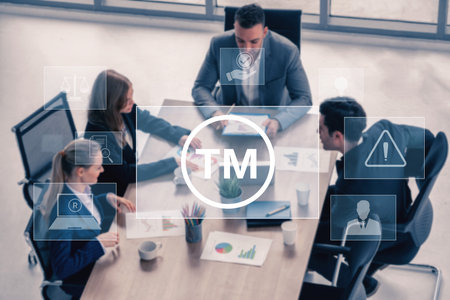 Trademark protection and legal compliance with TM icon, patent check, intellectual property rights, and branding regulation enforcement