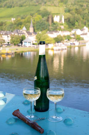 White quality riesling wine in green bottle served on old bridge across Mosel river with view on old German town in sunny day