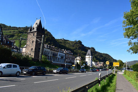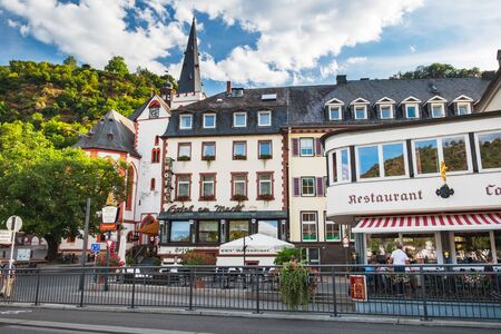 St Goar, Germany - August 11, 2018: Road along the River Rhine with beautiful old houses, hotels and restaurants in St Goar Town. Stiftskirche St Goar Evangelical Church in background.