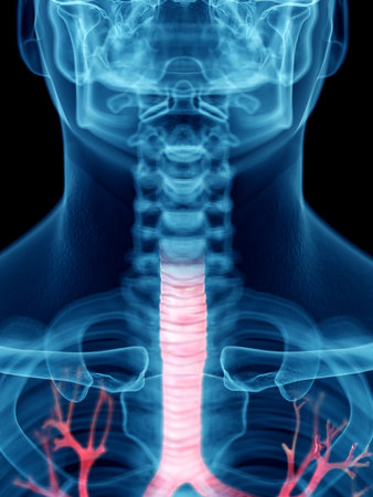 Detailed illustration of human anatomy the respiratory system and neck area in vibrant shades. the glowing effect emphasizes the trachea and surrounding structures for educational and medical design. Generative AI