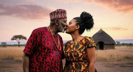 Elderly african couple embracing in colorful traditional attire amidst lush tropical garden
