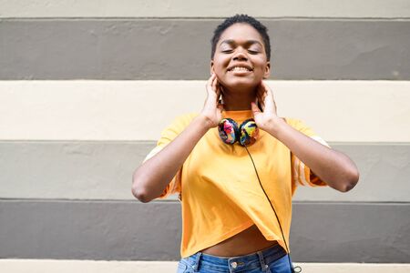 Happy African woman smiling on urban wall with eyes closed, wearing casual clothes and headphones.