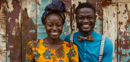 The Nigerian couple's playful energy shines against a rustic backdrop, complemented by their colorful traditional attire. Their coordinated looks speak of a stylish and joyful union