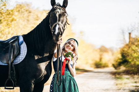 Pretty blonde in traditional dress walking with big black horse outdoors. Animal and people frienship concept.