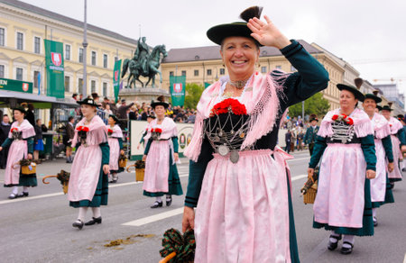 Munich, Germany - September 20, 2015: The Oktoberfest in Munich, Germany, is the biggest beer festival of th world. About 9000 people in historical costume groups, music bands, artists or riders with horses and carriages have participated at the public