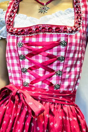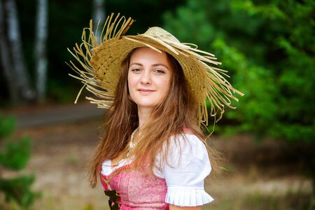 a woman in a beautiful traditional Bavarian dirndl dress at the Bavarian October fest (Oktoberfest) (Munich, Bavaria, Germany)