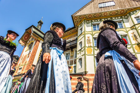 Bad Heilbrunn, Germany - July 14: participants of a typical pageant with traditional clothes in Bad Heilbrunn on July 14, 2019