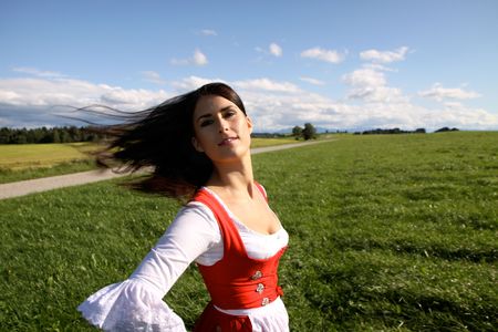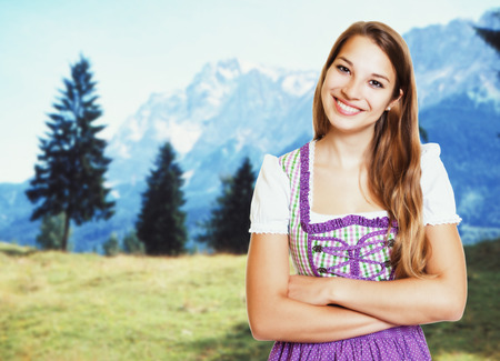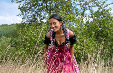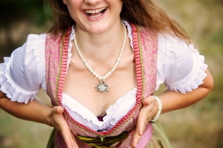 Laughing german woman in bavarian dirndl with rural landscape in the background