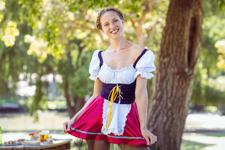 Pretty oktoberfest blonde smiling in the park on a sunny day