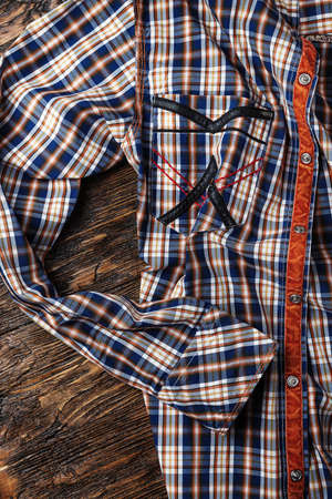 Beautiful men fashion shirt for clothing on wooden background - Vintage Filter Processing
