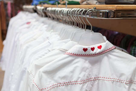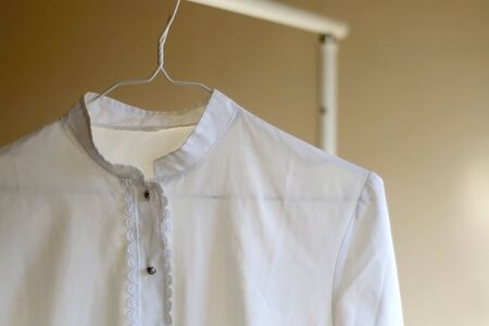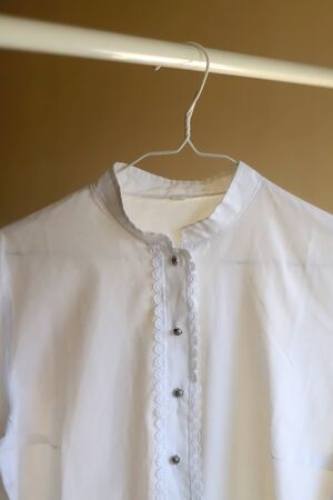 White vintage blouse on a clothing rack. Selective focus.