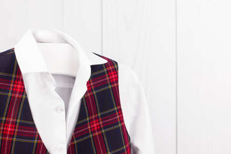 School uniform for a boy hangs on a hanger
