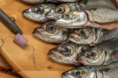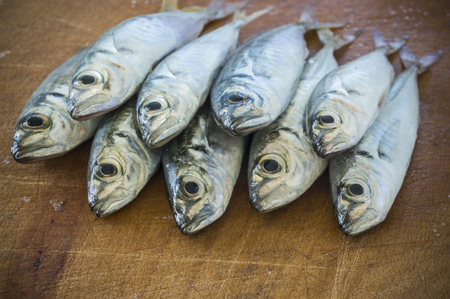 Small fishes on the wooden table. Sea mackerel fish closeup image. Mackerel fish top view in the market. Small fresh mackerel fishes. Fishing catch - bunch of mackerel. Fisherman's catch - fish pile