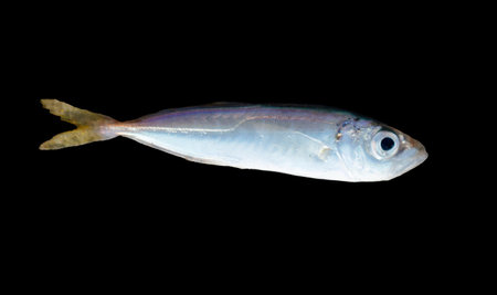 A fish is shown in a black background. The fish is small and has a yellow tail.