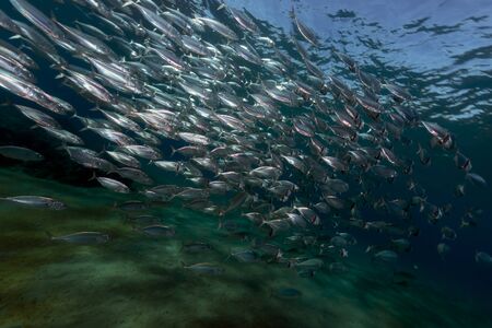 Massive school of sardines in a shallow reef. Sardine shoal or sardine run in Moalboal is a famous tourist destination in the southern town of Cebu, Philippines.