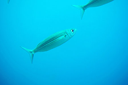 Group of small silver fish swimming in a vibrant blue ocean, forming a school and reflecting sunlight from the water's surface, showcasing marine life and aquatic environment