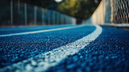 Close-up of a running track in a stadium with white striped markings. Generative AI
