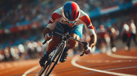 A man is riding a bicycle on a track. The man is wearing a blue outfit and a helmet. Concept of speed and athleticism