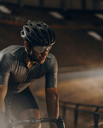 Focused cyclist in helmet riding on velodrome track with dramatic lighting.