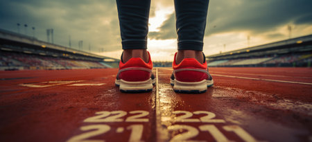 Close-up of the runner's feet as they start running on the stadium track, with a beautiful sunset in the background.