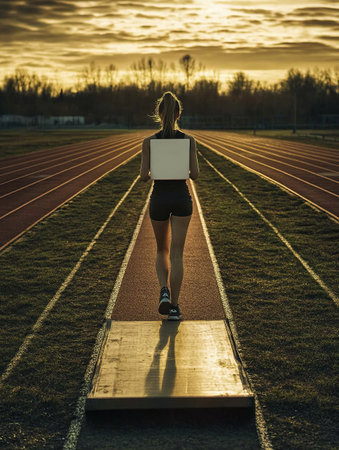 photo of a woman in casual sportswear holding a blank whiteboard, standing on a running track in the early morning, soft light --chaos 12 --ar 3:4 --weird 150 --v 6.1 Job ID: 0dc73b2b-c5d6-4b16-98a0-e15b9525421b