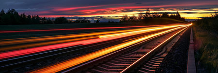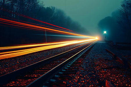 Railroad Track at Twilight Illuminated by Streaks of Light.