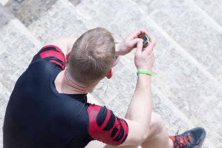Man sitting on the ground looking at an app on his cell phone after running outside. Focus on the mobile phone.