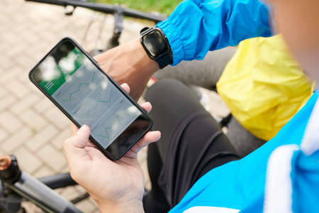 Active Asian young sportsman using a smartwatch or smart fitness band to track his outdoor workout and activities, man reviewing an exercise and health information after finished outdoor workout.