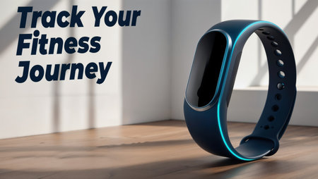 Black smart watch on wooden floor with text TRACK YOUR FUTURE JOURNEY