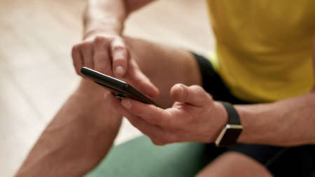 Fitness app. Cropped shot of a man using his smartphone while sitting on yoga mat at home