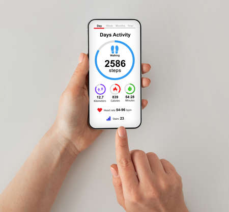 Young woman using application on smartphone when controlling her weight and consumed and burned calories