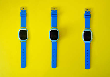 Wristwatch with GPS on a bright yellow background. Childrens GPS clock