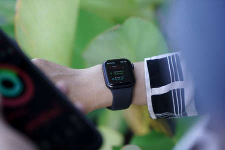 Bali Indonesia June 2, 2020 : female hands using with apple, Apple Watch is a line of smartwatches designed, developed, and marketed by Apple Inc.