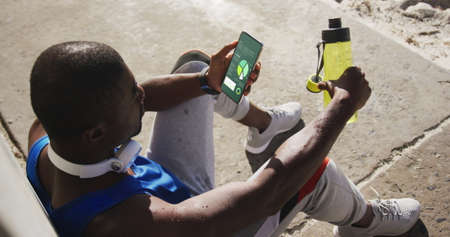 African american sportsman sitting at pavement, using smartphone with statistics on screen. communication, data technology and digital interface concept digitally generated image.